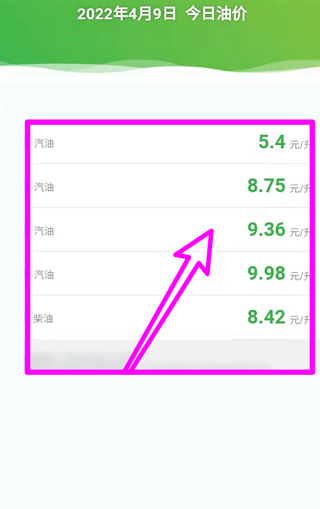 3. 进入详情页面后,即可查看所在区域最新的实时油价信息。