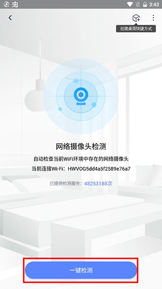 3、点击页面中的“一键检测”按钮,系统将自动扫描周围是否存在可疑摄像头信号。