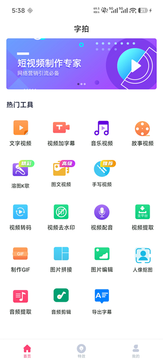 1. 打开字拍App,进入首页即可看到多个热门创作功能入口。