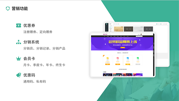 集成智能营销系统,助力机构降低招生成本、提升流量转化。支持会员卡、优惠券、优惠码、分销系统等多种营销工具自由组合使用。