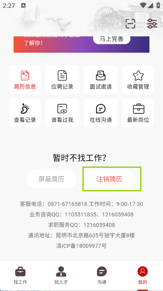 1. 进入“我的”页面,在个人中心区域找到“注销简历”选项并点击。