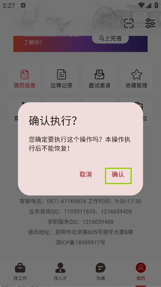 2. 系统将弹出“确认执行?”提示框,请仔细阅读说明后点击“确认”。注意:此操作不可逆,一经执行,简历信息将被永久删除,无法恢复。