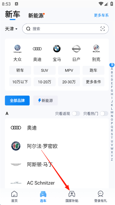 1、打开汽车报价App并完成登录,进入首页后点击【国家补贴】入口。