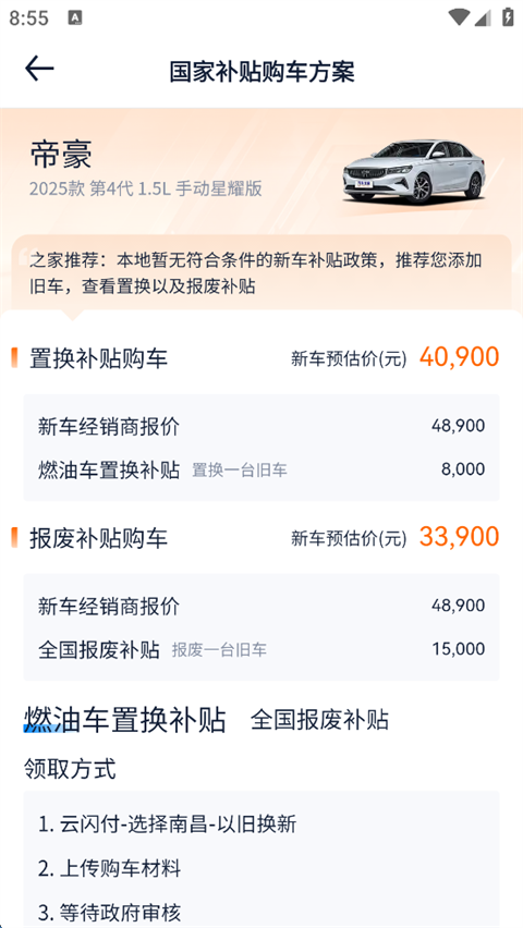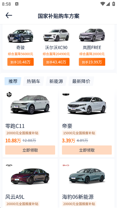 【政府/厂商补贴一站集齐】整合国家补贴、品牌新车补贴、置换补贴、平台优惠及4S店专属折扣,所有福利一目了然。