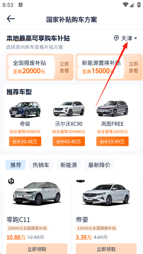 2、选择您当前所在的省市地区,系统将自动展示本地可享受的最高购车补贴额度。
