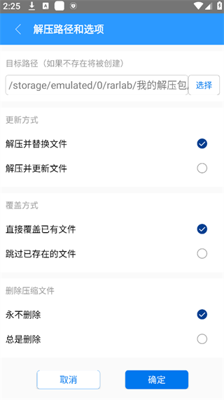 1. 解压设置:选择「解压文件」后,可自定义目标路径、文件覆盖策略(跳过/覆盖/重命名),并可勾选“解压后删除原压缩包”,确认后执行操作。
