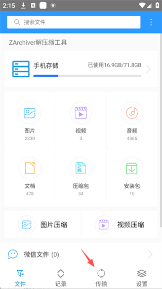 1. 打开ZArchiver,在底部导航栏点击「传输」进入文件传输界面;