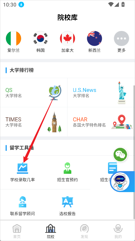 1、打开芥末留学App,在底部导航栏点击【院校】进入院校查询页面。