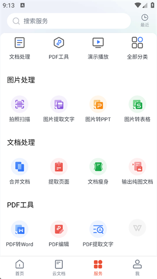 6. “服务”板块集中展示图片处理、文档转换、PDF工具等核心功能模块,满足多样化办公需求。