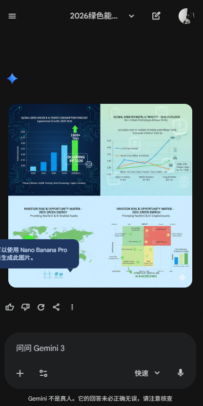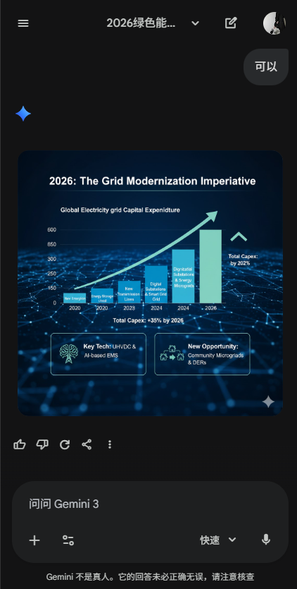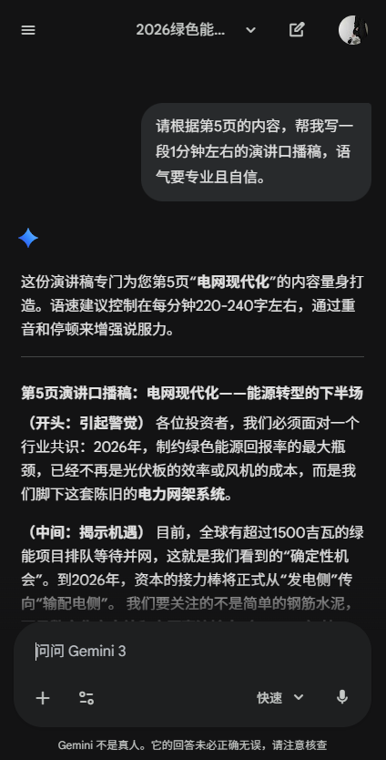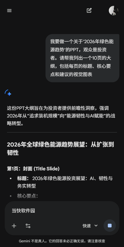 用户只需输入类似“我要做一个关于‘2026年绿色能源趋势’的PPT,观众是投资者。请帮我列出一个10页的大纲,包括每页的标题、核心要点和建议的视觉图表”的指令,Gemini便会输出逻辑严密的结构、每页详细文案,并标注适合插入图片或数据的位置,便于后续个性化调整。