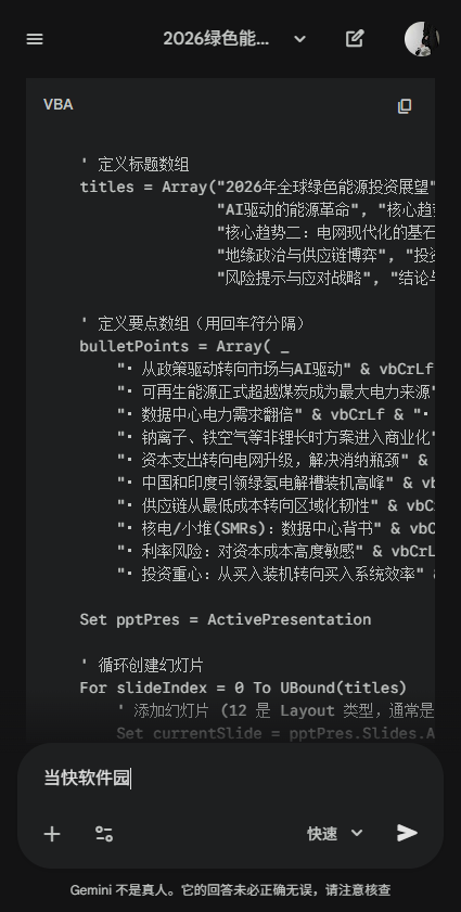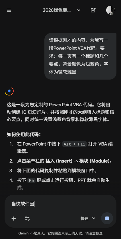1. 可要求Gemini根据已有内容生成PowerPoint VBA代码。例如输入:“请根据刚才的内容,为我写一段PowerPoint VBA代码。要求:每一页有一个标题和几个要点,背景颜色为浅蓝色,字体为微软雅黑。”