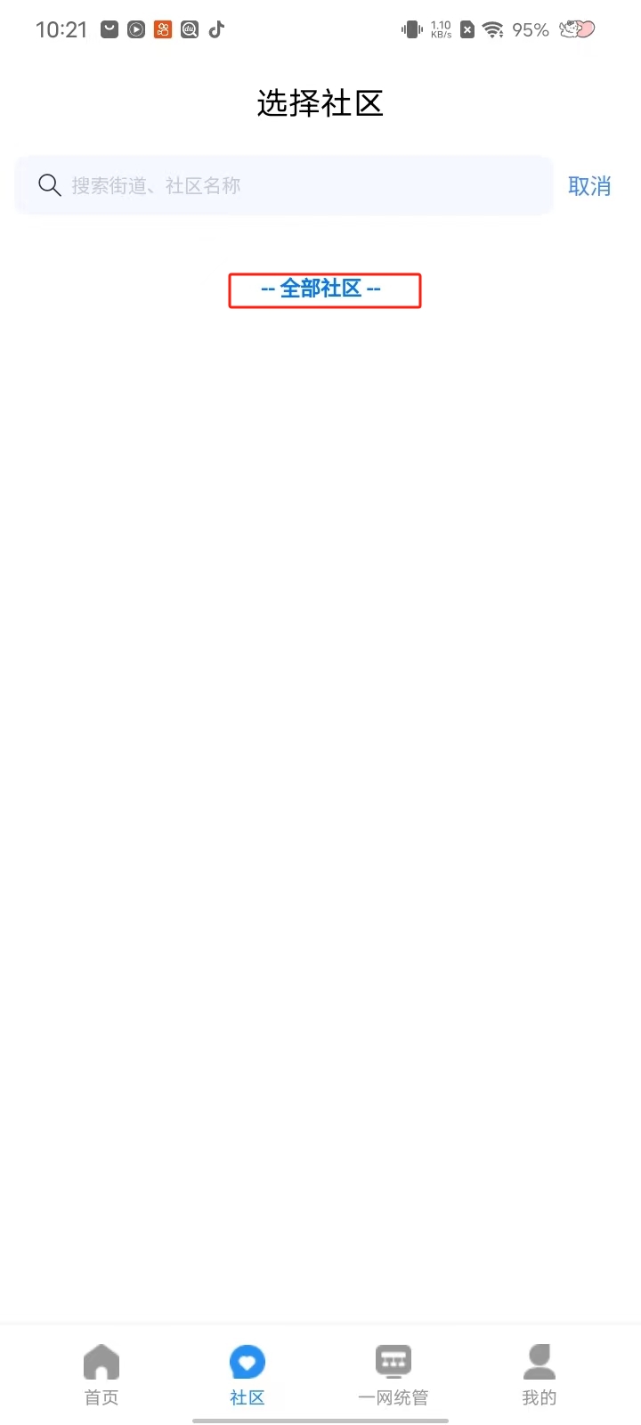 - 点击底部导航栏中的【社区】,进入后选择【全部社区】,或直接搜索所在街道、社区名称。