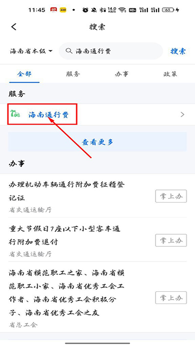 2. 在搜索栏中输入“海南通行费”并进行搜索;