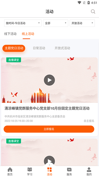 3、活动板块集中展示线上线下党建活动,支持按时间或主题精准检索,便于党员灵活参与。