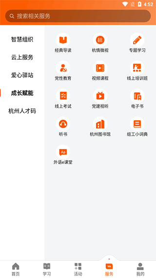 4、服务界面整合智慧组织、云上服务、爱心驿站、成长赋能及“杭州人才码”等特色功能,全方位支撑党员发展与社会服务。
