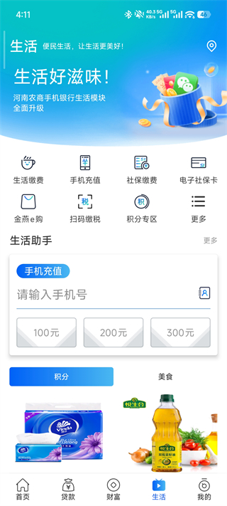 提供生活缴费、手机充值、社保缴纳等便民服务,并集成金燕e购商城、扫码缴税、积分兑换商品等实用功能,打造全方位生活助手。