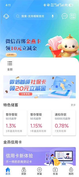 集中展示特色储蓄产品与金燕信用卡服务,提供快捷入口直达各类金融业务,界面清晰、操作直观。