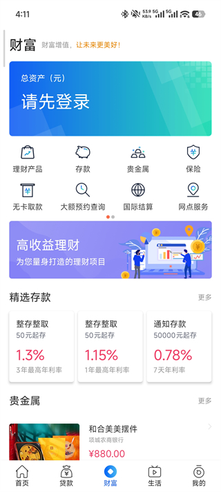 整合理财产品、定期存款、贵金属、保险等财富管理服务,同时支持无卡取款预约、大额存取查询等功能,登录后可一站式查看总资产状况。