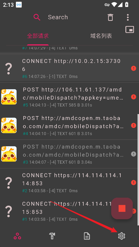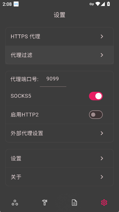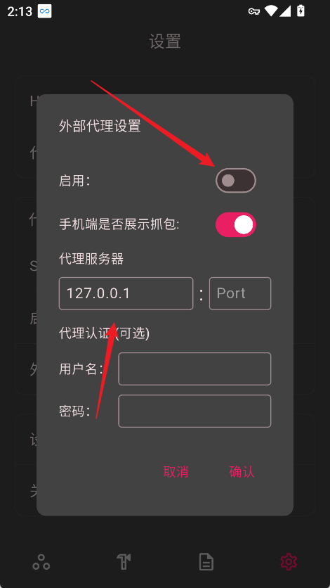 1. 打开 ProxyPin 抓包工具,进入主界面后点击右下角【设置】选项。