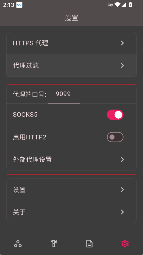 2. 在设置页面中先配置本地代理端口,再进入【外部代理】相关设置项。