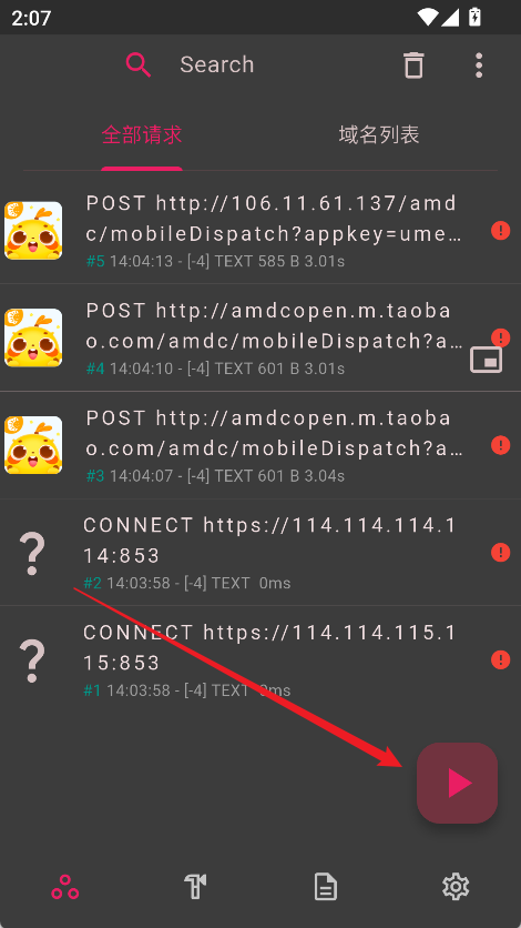3. 界面将实时展示所有网络请求,点击右上角“三点”菜单可进入更多选项。